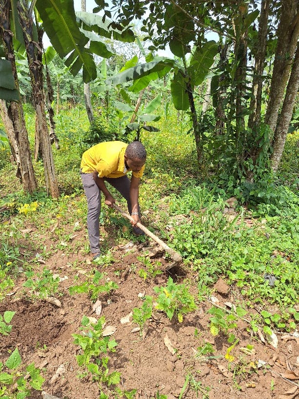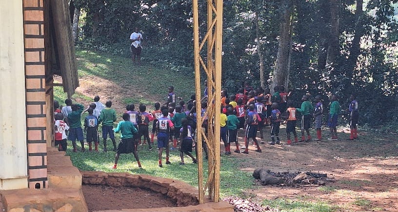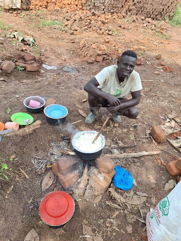 Op de bouw: De metselaars koken zelf hun posho voor de lunch. Ondertussen plant ik suikerriet. Het gat graven wordt voor me gedaan.